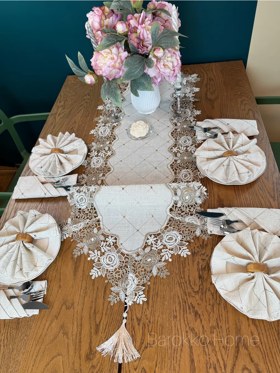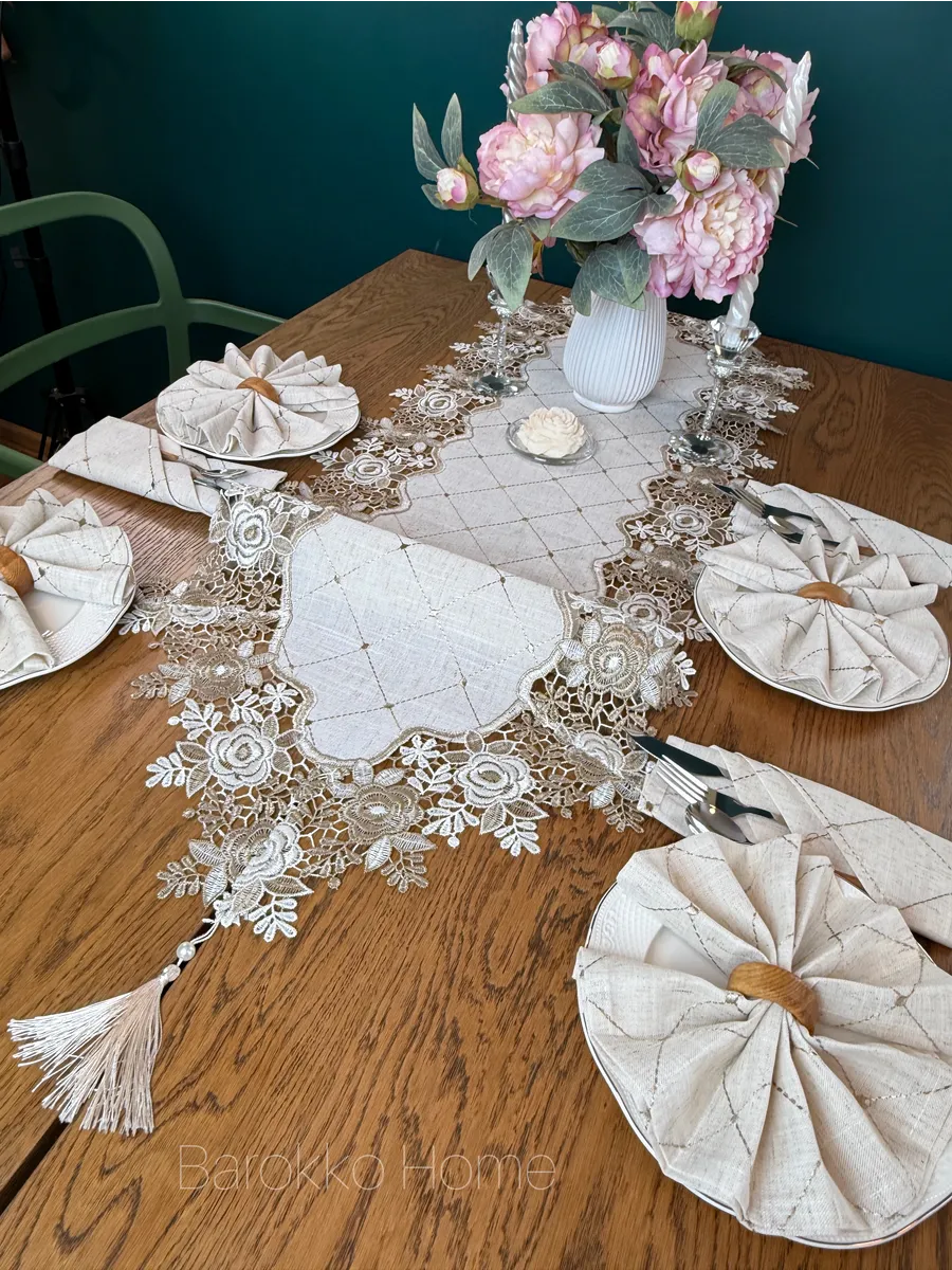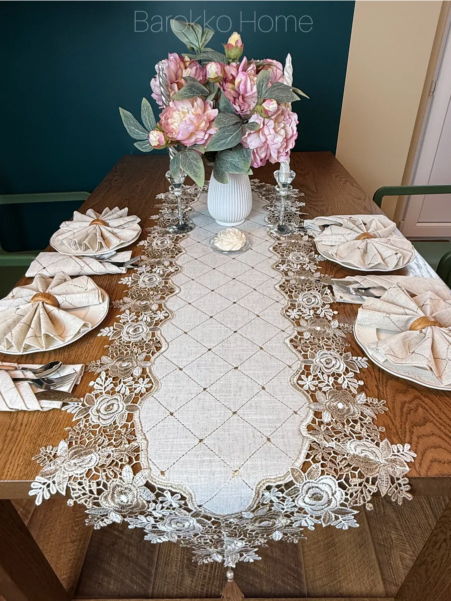 Представляем вашему вниманию комплект - дорожка на стол + 6 салфеток. Льняная скатерть дорожка размера 40*190 см - это идеальный выбор для тех, кто ценит роскошь и изящество. Этот прекрасный предмет интерьера будет дополнять любую столовую или кухню, придавая им элегантный и стильный вид. Брюссельское кружево на краях салфетки добавляет ей особого шарма и уюта. Этот подарок будет идеальным выбором для ваших близких и друзей, чтобы отметить особые моменты в их жизни.
