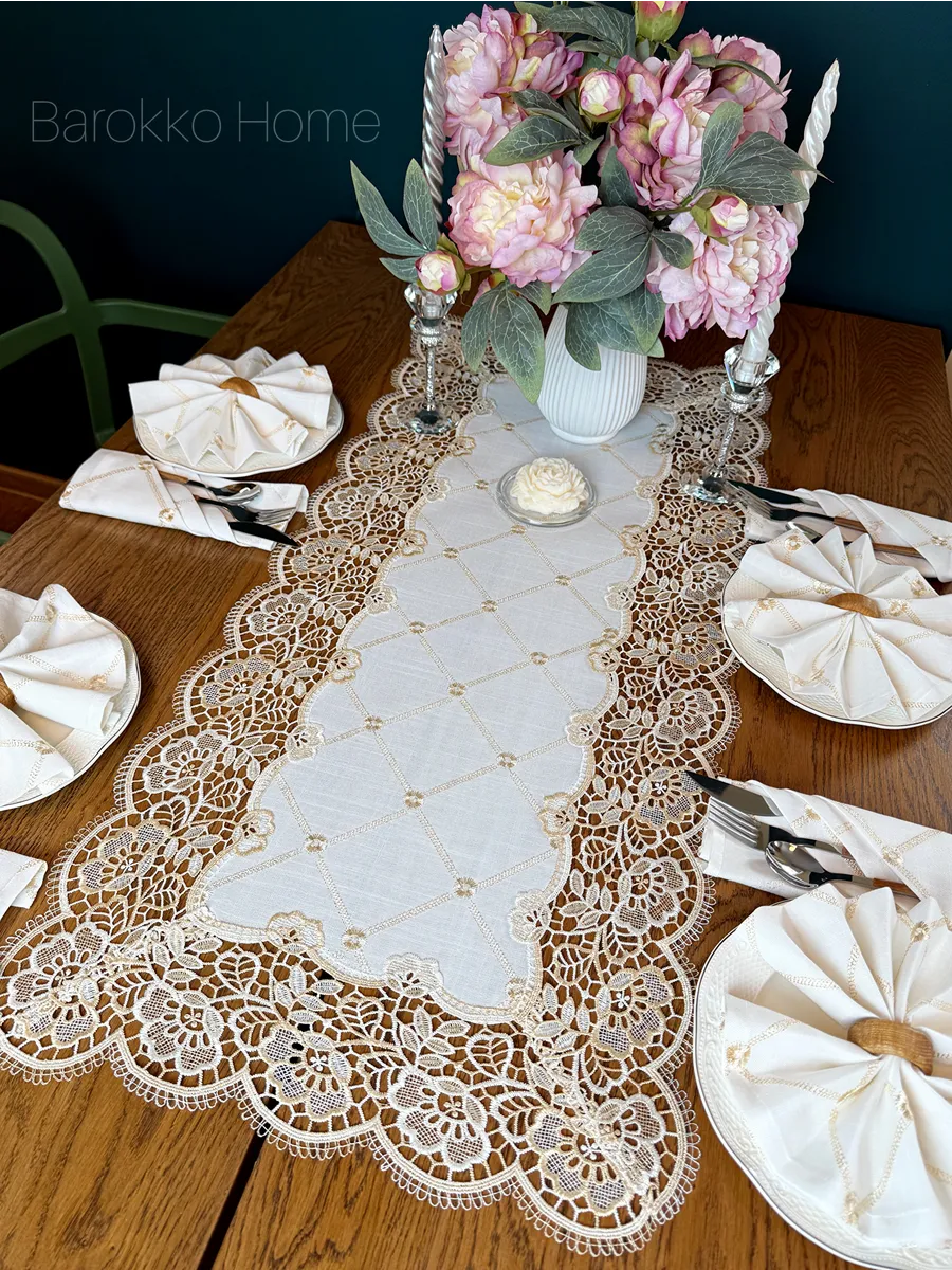 Представляем вашему вниманию комплект - дорожка на стол + 4 салфетки. Льняная скатерть дорожка размера 40*90 см - это идеальный выбор для тех, кто ценит роскошь и изящество. Этот прекрасный предмет интерьера будет дополнять любую столовую или кухню, придавая им элегантный и стильный вид. Брюссельское кружево на краях салфетки добавляет ей особого шарма и уюта. Этот подарок будет идеальным выбором для ваших близких и друзей, чтобы отметить особые моменты в их жизни.